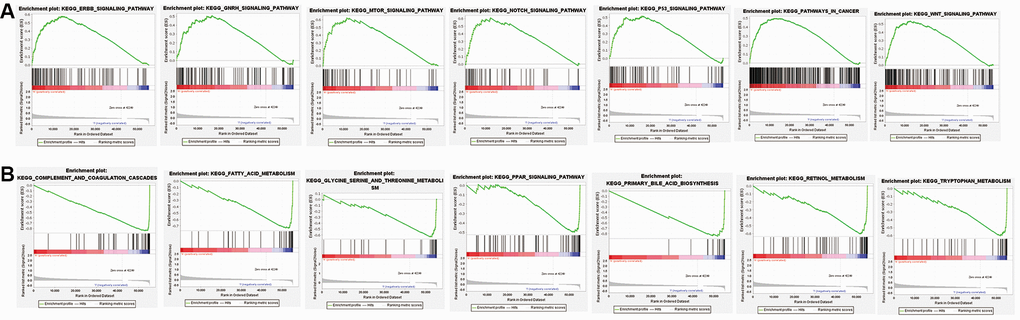 GSEA results demonstrate an obvious enrichment of immunoregulatory pathways against cancer in high-risk HCC patients, such as the mTOR signaling pathway, WNT signaling pathway, ERBB signaling pathway, GNRH signaling pathway, NOTCH signaling pathway, and P53 signaling pathway. Meanwhile, GSEA results demonstrate a remarkable enrichment of amino acid metabolism in low-risk HCC patients, including glycine, serine, and threonine metabolism, as shown in Figure 7 and Supplementary Table 7.