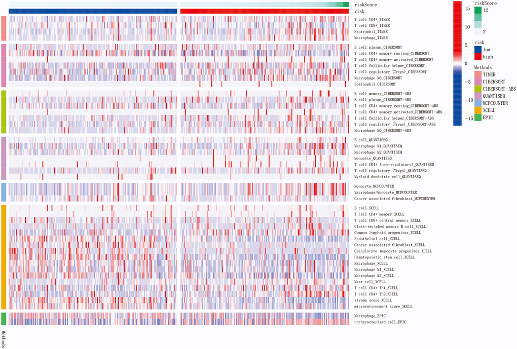 Based on the obtained ferroptosis-related lncRNA signature, gene set enrichment analysis (GSEA) (version 4.1.0) was used to examine the KEGG pathway analysis between the high-risk subgroup and the low-risk subgroup. In addition, based on our signature, the TIMER [18], CIBERSORT [19], CIBERSORTABS [19], QUANTISEQ [20], MCPCOUNTER [21], XCELL [22], and EPIC [23] algorithms were compared to evaluate the fraction of tumor-infiltrating immune cells in the high-risk subgroup and low-risk subgroup. A heatmap was used to find the distinction in immune response based on distinct algorithms. Additionally, previous literature was used to find a possible immunity check-point.