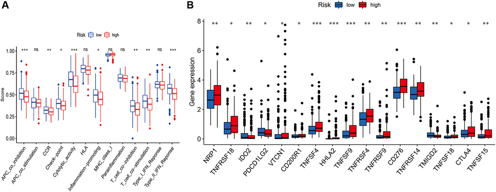 TIMER, CIBERSORT, CIBERSORTABS, QUANTISEQ, MCPCOUNTER, XCELL, and EPIC algorithms were used to examine the immune cell and pathway profiles in the signature-identified high-risk and low-risk groups (Figure 8, all P < 0.05). Based on single sample gene set enrichment analysis (ssGSEA) of TCGA-HCC data, correlation analysis between immune cell subgroups and associated functions showed that T cell functions such as APC co-inhibition, CCR, checkpoint, cytolytic activity, inflammation promoting, type II IFN response, T cell co-stimulation, T cell co-inhibition response were markedly different between the high- and low-risk groups, as shown in Figure 9A (P < 0.05). In view of the significance of immunotherapies based on checkpoint inhibitors, the distinction in expressing immune checkpoints between the two groups was further explored. The high-risk group expressed more pervasive immune checkpoint molecules such as NRP1, CD276, TNFRSF14, and TNFRSF4 than the low-risk group (Figure 9B, P < 0.05).