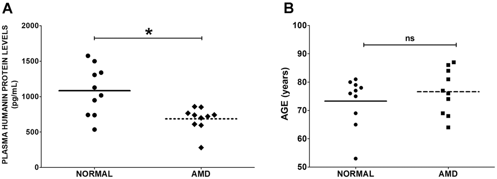 To determine the levels of Humanin protein in the plasma from AMD patients and normal subjects, ELISA assay was performed. We found that Humanin protein levels were reduced by 36.58 % (P = 0.0155) in the plasma from AMD patients: 686.1 ± 52.67 (Mean ± SEM) pg/mL; n=10, compared to that in the plasma from age-matched normal subjects: 1082 ± 110.1 pg/mL; n=10 (Figure 1A). We found no significant difference in the mean ages of normal subjects vs. AMD patients: Normal: 73.30 ± 2.753 years; AMD: 76.60 ± 2.513 years; P = 0.5702 (Figure 1B).