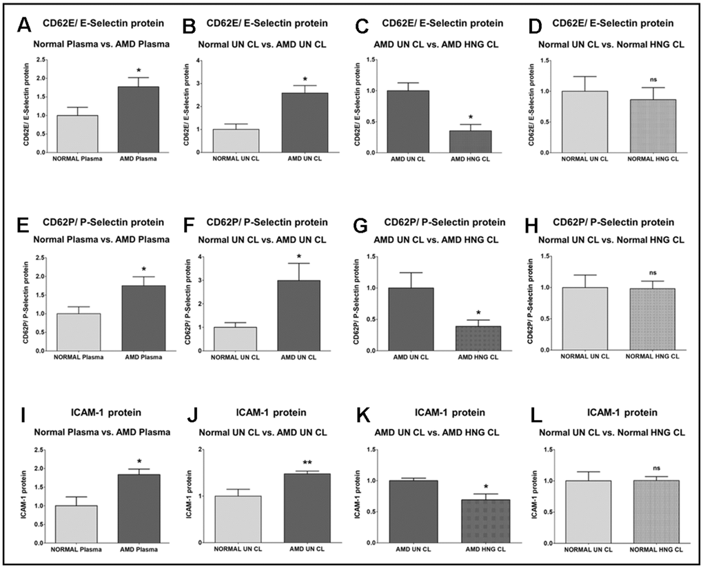 P-Selectin (Platelet-Selectin)/ CD62P (CD62 antigen-like family member P) protein level was significantly higher by 75 % in AMD plasma compared to normal plasma: P = 0.0426; Normal plasma = 1 ± 0.1853 a.u.; AMD plasma = 1.750 ± 0.2407 a.u. (Figure 2E). Untreated AMD cell lysates also showed 198.9 % higher CD62P/P-Selectin protein levels compared to untreated normal cell lysates: P = 0.0317; NL UN CL = 1 ± 0.1980 a.u.; AMD UN CL = 2.989 ± 0.7296 a.u. (Figure 2F). Treatment with HNG reduced CD62P/P-Selectin protein levels by 60.99 % in AMD cells: P = 0.0420; AMD UN CL = 1 ± 0.2441 a.u.; AMD HNG CL = 0.3901 ± 0.09880 a.u. (Figure 2G). Addition of HNG to normal cells reduced CD62P/ P-Selectin protein levels by 1.94 %, but the difference was non-significant: P = 0.9347; Normal UN CL = 1 ± 0.1980 a.u.; NL HNG CL = 0.9806 ± 0.1225 a.u. (Figure 2H).
