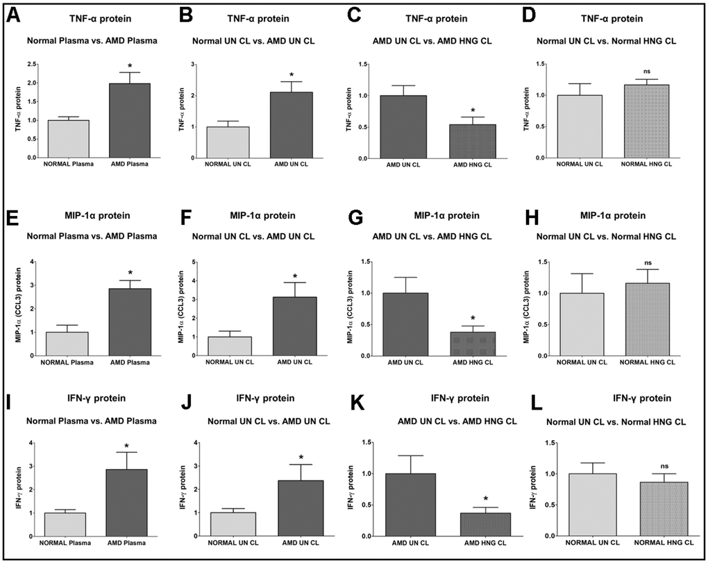 IFN-γ (Interferon-gamma) protein level was significantly higher by 186.1 % in AMD plasma compared to normal plasma: P = 0.0286; Normal plasma = 1 ± 0.1416 a.u.; AMD plasma = 2.861 ± 0.7355 a.u. (Figure 3I). Untreated AMD cell lysates also showed 137.3 % higher IFN-γ protein levels compared to untreated normal cell lysates: P = 0.0381; NL UN CL = 1 ± 0.1748 a.u.; AMD UN CL = 2.373 ± 0.6844 a.u. (Figure 3J). Treatment with HNG reduced IFN-γ protein levels by 62.86 % in AMD cells: P = 0.0381; AMD UN CL = 1 ± 0.2884 a.u.; AMD HNG CL = 0.3714 ± 0.09164 a.u. (Figure 3K). Addition of HNG to normal cells reduced IFN-γ protein levels by 13.5 %, but the difference was non-significant: P = 1; Normal UN CL = 1 ± 0.1748 a.u.; NL HNG CL = 0.8650 ± 0.1353 a.u. (Figure 3L).
