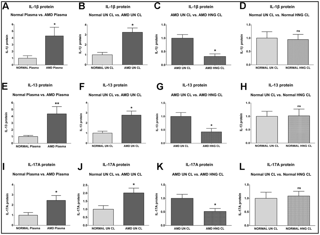 IL-17A (Interleukin-17) protein was significantly increased by 145.7 % in AMD plasma compared to normal plasma: P = 0.0317; Normal plasma = 1 ± 0.2619 a.u.; AMD plasma = 2.457 ± 0.4793 a.u. (Figure 4I). Untreated AMD cell lysates also showed 101.4 % higher IL-17A protein levels compared to untreated normal cell lysates: P = 0.0159; NL UN CL = 1 ± 0.2259 a.u.; AMD UN CL = 2.014 ± 0.2994 a.u. (Figure 4J). Treatment with HNG reduced IL-17A protein levels by 48.31 % in AMD cells: P = 0.0303; AMD UN CL = 1 ± 0.1487 a.u.; AMD HNG CL = 0.5169 ± 0.1098 a.u. (Figure 4K). Addition of HNG to normal cells caused no change in the IL-17A protein levels: P = 0.8413; Normal UN CL = 1 ± 0.2259 a.u.; NL HNG CL = 1.087 ± 0.1721 a.u. (Figure 4L).