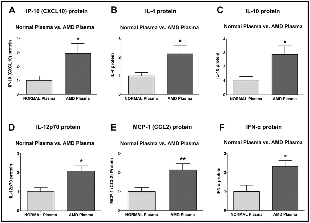 IP-10 (Interferon-gamma-induced Protein 10)/ CXCL10 (C-X-C motif chemokine Ligand 10) protein was significantly higher by 193.5 % in AMD plasma compared to normal plasma: P = 0.0286; Normal plasma = 1 ± 0.3277 a.u.; AMD plasma = 2.935 ± 0.7114 a.u. (Figure 5A).