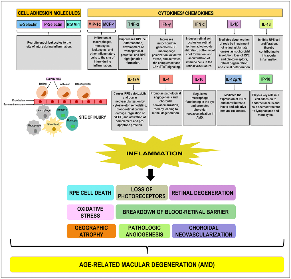 The eye is an immune-privileged organ and therefore immune responses to foreign antigens are suppressed or inhibited. The eye is protected by anatomical barriers such as the blood-retinal barrier formed by tight junctions of the endothelial cells and also the retinal pigment epithelial (RPE) cells. Furthermore, retinal neurons, RPE cells, and ocular fluids express immune modulators that can suppress activation of complement, microglial cells, and macrophages. However, acute insults contribute to retinal inflammation and subsequent retinal degeneration [3]. Inflammatory processes, primarily components of innate immunity including the complement system, microglia, macrophages, cytokines, and chemokines drive the progression of age-related macular degeneration (AMD) disease that is a leading cause of vision loss in the United States [4, 5]. A clinical hallmark of AMD is the formation of drusen deposits between the RPE cells and Bruch’s membrane, and drusen deposits are composed of inflammatory cytokines and complement proteins [6–8]. Cigarette smoking triggers the secretion and activation of proinflammatory cytokines and causes immune suppressive effects [9]. Recruitment of macrophages at the choroid leads to choroidal inflammation and abnormal blood vessel growth, thereby contributing to choroidal neovascularization in wet AMD. Macrophage polarization determines the potential of macrophages to regulate angiogenesis [10, 11]. AMD pathology is characterized by activation of inflammatory cytokines that in turn influences the polarization of macrophages. Furthermore, the infiltration of retinal microglia into the outer retina in the aged eye results in interaction of RPE cells with microglia, which in turn causes critical structural and physiological changes in the RPE, thereby contributing to neuroinflammation in AMD [12, 13].
