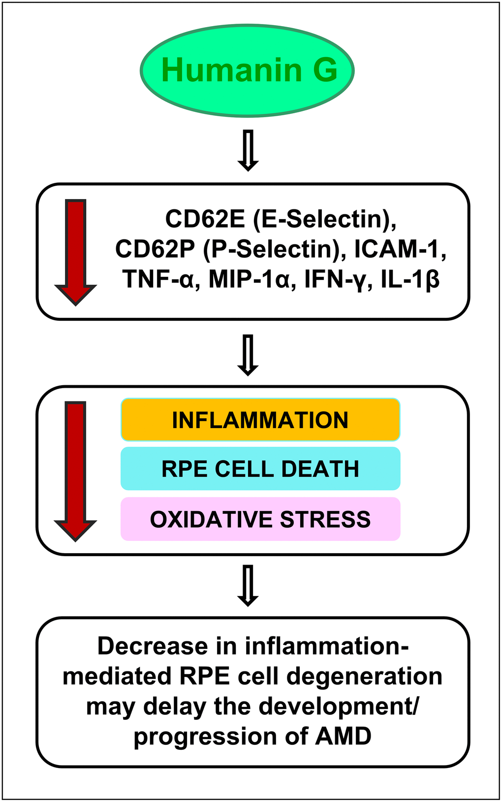 Further studies are required to gain an in-depth understanding of the mechanisms underlying Humanin G-mediated suppression of inflammation in AMD and to establish Humanin G’s therapeutic potential as an inhibitor of AMD-associated inflammation. Furthermore, in addition to administration of Humanin G, knockdown or knock-out of the studied inflammatory markers using siRNA or CRISPR editing, may present a new line of treatment for AMD.