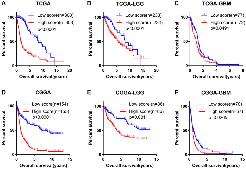 In TCGA dataset, KM analysis showed that glioma patients in the low-score group displayed significantly longer OS than that seen in the high-score group (Figure 2A). In addition, following stratification by World Health Organization (WHO) grade, the prognostic value of the angiogenesis pathway score was consistent with that seen overall in the TCGA cohort (Figure 2B, 2C). Furthermore, KM analyses conducted in the CGGA, CGGA (array) and GSE16011 datasets evaluating the prognostic value of the angiogenesis pathway score obtained consensus results (Figure 2D–2F, Supplementary Figure 2A–2F). These results demonstrated the powerful potential of the angiogenesis pathway score in predicting prognosis in glioma patients.