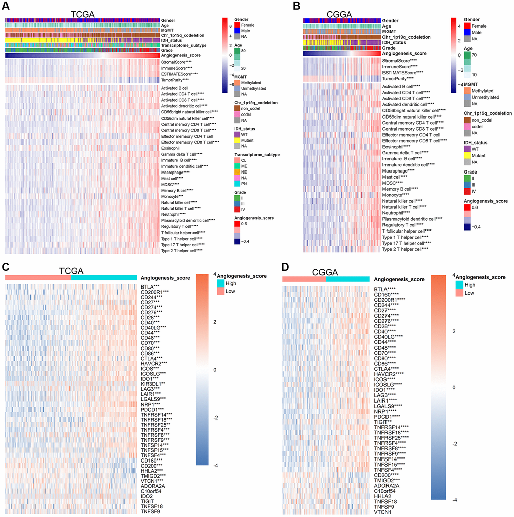 Microvessels are an important component of the glioma microenvironment and increased angiogenesis in gliomas improves microcirculation. Bearing this in mind, we speculated the angiogenesis pathway score might be associated with the purity of glioma and the enrichment degree of immune cells within the glioma microenvironment. To examine this, we first checked correlation between the angiogenesis pathway score and glioma purity. In the TCGA, CGGA, and CGGA (array) datasets, the stromal, immune, and ESTIMATE scores were significantly positively correlated with the angiogenesis pathway score. However, the correlation between tumor purity and the angiogenesis pathway score was just the opposite (Figure 4A, 4B, Supplementary Figure 4A). Additionally, we also found that the enrichment levels of most immune cells in the high-score group were significantly higher than those in the low-score group (Figure 4A, 4B, Supplementary Figure 4A). These findings indicate that in addition to angiogenesis itself reducing the purity of gliomas, angiogenesis can also reduce glioma purity by increasing the enrichment of immune cells within the glioma microenvironment. Previous study confirmed that low glioma purity is associated with unfavorable prognosis [32]. This further conforms the accuracy of the angiogenesis pathway score in predicting the prognosis of glioma.
