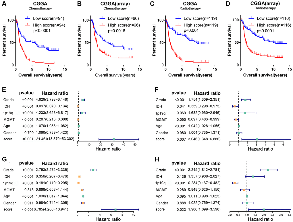 Despite compelling effects in other cancers, the outcomes of anti-angiogenic therapies, such as bevacizumab, and cilengitide, were disappointing in gliomas [26]. Gliomas are easily resistant to those agents. In addition, gliomas tend to be resistant to radiotherapy and chemotherapy. Considering the relationship between the angiogenesis pathway score and the malignant phenotype of glioma, we speculated that the score might be related to the treatment tolerance of glioma. Thus, we further explored the prognosis of glioma patients who received different treatments in CGGA and CGGA (array) cohorts. Interestingly, in glioma patients who received radiotherapy or chemotherapy, the OS of the high-score group was significantly shorter than that of the low-score group (Figure 6A–6D). We analyzed LGG and GBM separately and found that the score can distinguish the prognosis of patients receiving different treatments (Supplementary Figure 6A–6H). Univariate and multivariate COX regression analysis also found that the score is an independent prognostic factor for glioma patients receiving chemotherapy or radiotherapy (Supplementary Figure 7A–7H). To develop a therapy target, it is important to analyse the correlation between angiogenesis score and existing drugs. In our study, drug-sensitivity analysis revealed that angiogenesis score was positively correlated with Axitinib, Imatinib, Vorinostat and negatively correlated with Cetuximab, Cisplatin and Docetaxel in the cancer therapeutic response portal database (Supplementary Figure 8). These results show that the angiogenesis score can not only accurately predict the prognosis of glioma patients, but also show the potential of guiding chemotherapy dosing.