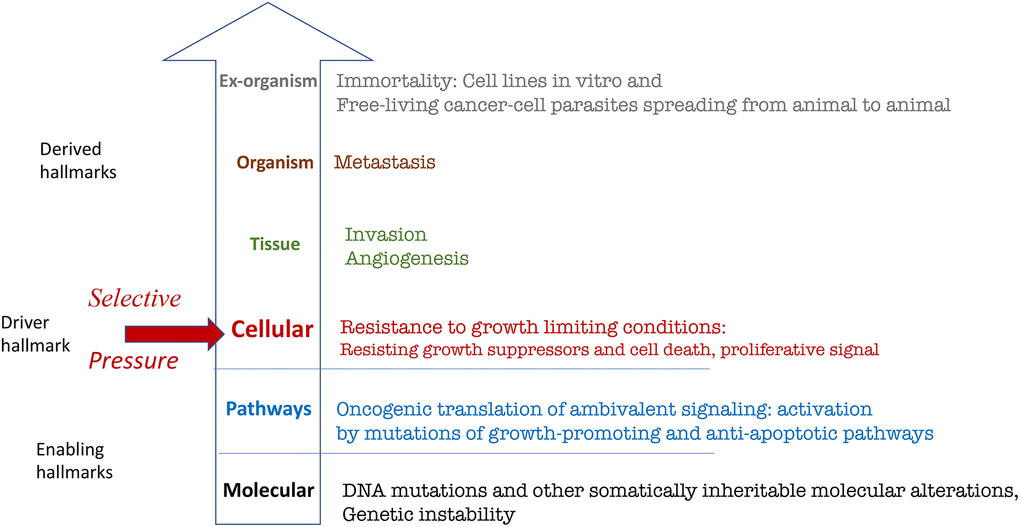 Oncogenic mutations make cancer cells resistant to growth-limiting conditions (a definition of oncogenic-type of resistance was discussed previously [4]). This is the driver hallmark of cancer because it provides a selective advantage to cancer cells. Cells, capable of proliferation, are unicellular organisms in a Darwinian sense [2, 14, 15]. Selection can be “natural” (during carcinogenesis) and “artificial” (during cancer therapy) [14, 16]. For example, selection for therapy resistance increases oncogenic properties of cancer cells because many mutations in oncogenes and tumor suppressors that render cells drug-resistant also make them more oncogenic [5, 17–19]. Simultaneously, the same combination of mutations enables metastasis and other higher-level hallmarks. There is no direct selection for metastatic potential, angiogenesis and immortality. They are derived hallmarks.