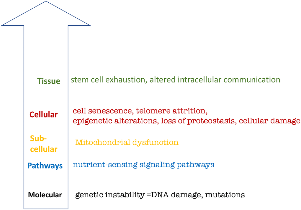 To start with, let us depict the hallmarks of aging suggested by López-Otín et al. [38] based on the hierarchical principle. This representation renders hallmarks tangible but reveals three shortcomings (Figure 2).