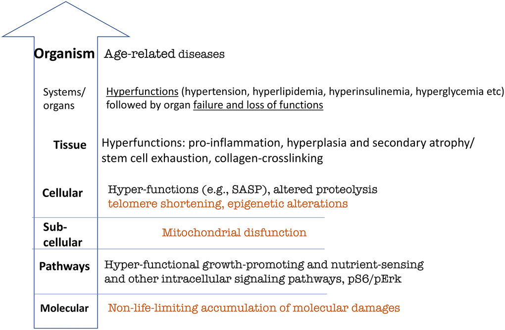 Let us depict hallmarks of aging, according to the hyperfunction theory of aging (Figure 3).