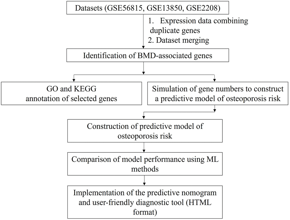 Artificial intelligence (AI) simulates human intelligence using machines, especially computer systems. AI can be used to analyze and improve the predictive performance of models in various research areas. Machine learning (ML), a major branch of AI, has been used in conjunction with bioinformatic functional analysis to identify predictive markers of osteoporosis [12, 13]. Kim et al. [14] and Shim et al. [15] developed machine learning models to accurately identify the risk of osteoporosis in postmenopausal women.