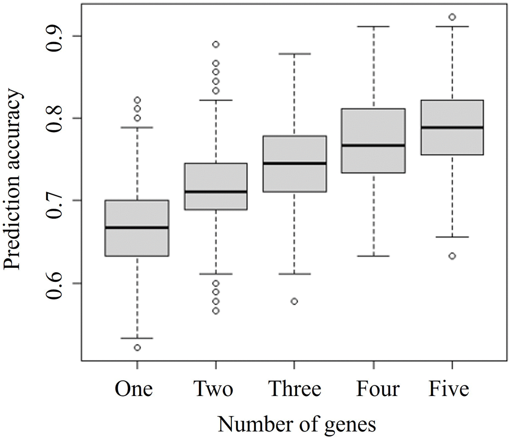 To select the optimal number of combined biomarkers for risk prediction, we tested random sets of 1–5 genes, with 1000 replicates, and evaluated associations between the number of genes and predictive model accuracy (Figure 3).