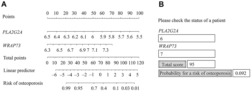 A nomogram was constructed using the gene set of PLA2G2A and WARP73 (Figure 4A), as the best combination of two genes for predicting the risk of osteoporosis (Table 3).