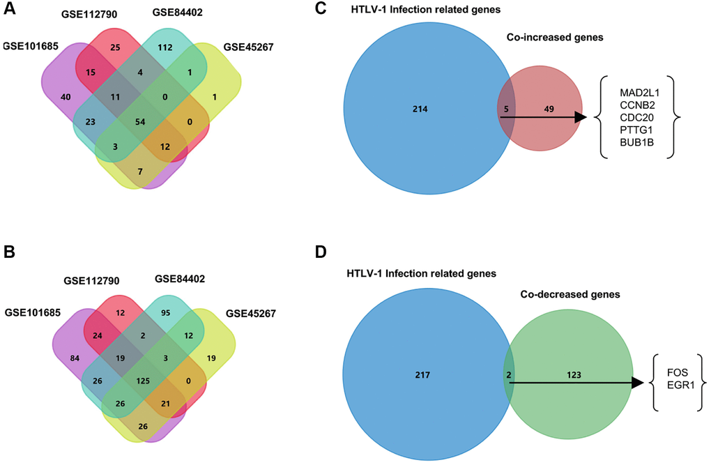 The bioinformatics tools and public databases used in this study was summarized in Supplementary Table 5. Briefly, four GSE datasets were obtained from the gene expression omnibus (GEO) database for the identification of co-differentially expressed genes (co-DEGs) in HCC. GSE101685 included 10 normal liver tissues and 24 HCC tissues. GSE112790 included 15 normal liver tissues and 183 HCC tissues. GSE45267 included 39 normal liver tissues and 48 HCC tissues. GSE84402 included 14 paired normal liver and HCC tissues. HTLV-1 infection associated genes were downloaded as a dataset from the MalaCards database. A Venn diagram was used for filtering overlapping genes among the aforementioned datasets.