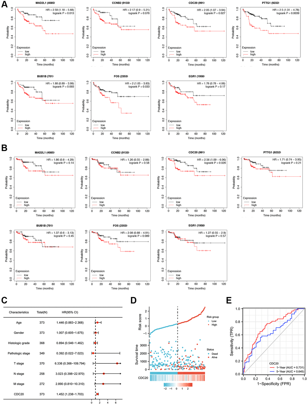 Furthermore, we conducted a multivariate analysis to assess the correlation between overall survival and multivariable characteristics, and the results showed that CDC20 expression was an independent factor for patient prognosis (Figure 2C, Supplementary Table 3). Figure 2D exhibited the distribution of CDC20 expression, the survival time of patients with HCC, and risk score profiles. Moreover, the ROC curve indicated that CDC20 expression possesses promising prognostic power. The AUC of CDC20 expression was 0.731 and 0.645 for predicting 1-year and 5-year overall survival, respectively (Figure 2E). These results suggest that CDC20 is a promising prognostic biomarker in patients with HCC.