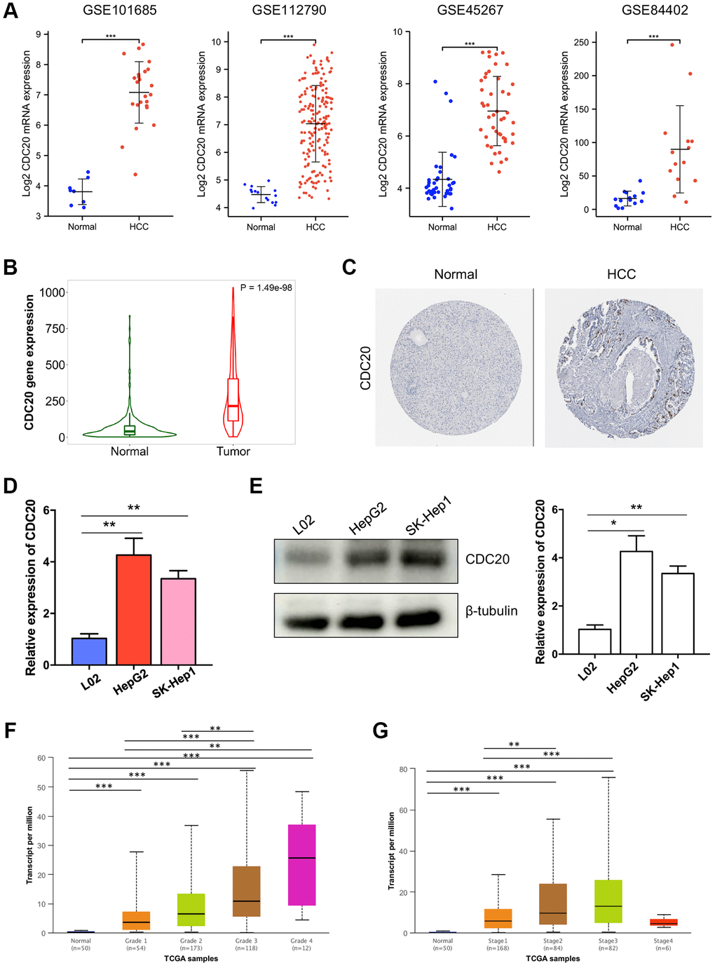 The expression profiles of CDC20 were further confirmed using several databases and in vitro experiments. First, four aforementioned datasets, GSE101685, GSE112790, GSE45267, and GSE84402, exhibited that the transcriptional level of CDC20 was significantly up-regulated in HCC tumor tissues than in normal liver tissues (Figure 3A). Then, the TNM plot and THPA database showed that the mRNA and protein expression levels of CDC20 were significantly higher in HCC tissues (Figure 3B and 3C). Furthermore, the up- regulation of CDC20 transcriptional and protein expression was confirmed in hepatocellular carcinoma cells HepG2 and SK-Hep1 compared with the normal liver cell L02 through qPCR and Western Blot. These results showed that CDC20 expression was significantly increased in hepatocellular carcinoma tissues and cell lines (Figure 3D and 3E).