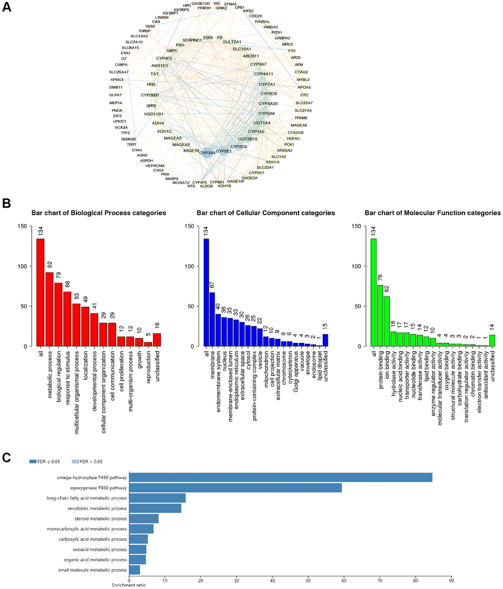 Here, cBioPortal and Cytoscape were enrolled to identify the network of 134 CDC20-associated genes in HCC patients (Supplementary Table 4). Among them, CYP3A4, CYP2E1, CYP2C9, and UGT2B15 were the top 4 genes that had the strongest correlation with CDC20 (Figure 4A). Then we presented the functional enrichment analysis of CDC20 in patients with HCC. Gene Ontology (GO) annotation revealed that CDC20 mainly involved the biological processes such as metabolic process, biological regulation, response to stimulus, and multicellular organismal process. Moreover, cell membrane, endomembrane system, nucleus, and membrane-enclosed lumen were the top 4 cellular components that were associated with the location and function of CDC20. Then the molecular functions correlated with CDC20 were evaluated. Consequently, protein binding, ion binding, hydrolase activity, and nucleic acid binding were on the list (Figure 4B). In addition, the Kyoto Encyclopedia of Genes and Genomes (KEGG) pathway analysis filtered 5 signaling pathways which were the most relevant to CDC20. They were the omega-hydroxylase P450 pathway, epoxygenase P450 pathway, long-chain fatty acid metabolic process, xenobiotic metabolic process, and steroid metabolic process (Figure 4C).