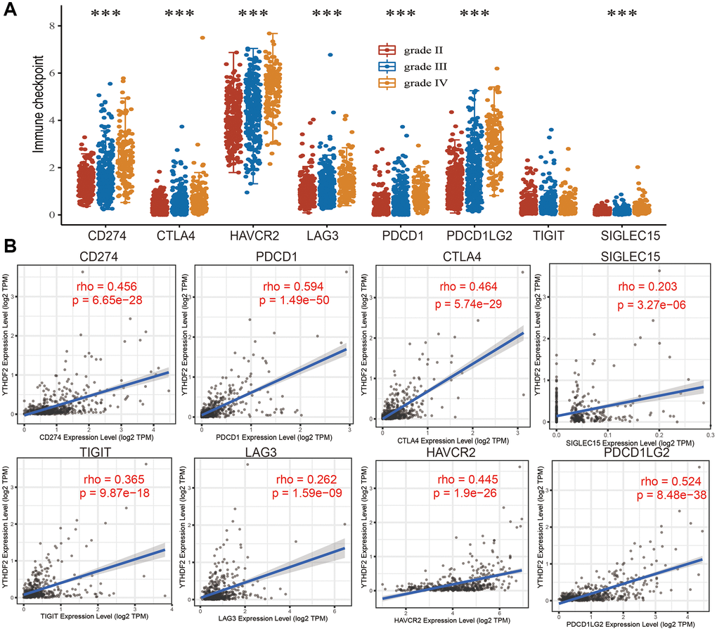 We analyzed the immune checkpoints related gene expression distribution in WHO grade II, III and IV gliomas tissues, the result demonstrated that immune checkpoints related gene differential expression in diverse samples (Figure 10A). In addition, we also analyzed the relationship between expression of YTHDF2 and immune checkpoint-related genes by Pearson correlation analysis in LGGs. Result shown that YTHDF2 expression was significantly positively correlated with CD274 (cor = 0.456, P = 6.65e-28), CTLA4 (cor = 0.464, P = 5.74e-29), HAVCR2 (cor = 0.445, P = 1.9e-26), LAG3 (cor = 0.262, P = 1.59e-09), PDCD1 (cor = 0.594, P = 1.49e-50), PDCD1LG12 (cor = 0.524, P = 8.48e-38), TIGIT (cor = 0.365, P = 9.87e-18), SIGLEC15 (cor = 0.203, P = 3.27e-06) (Figure 10B).