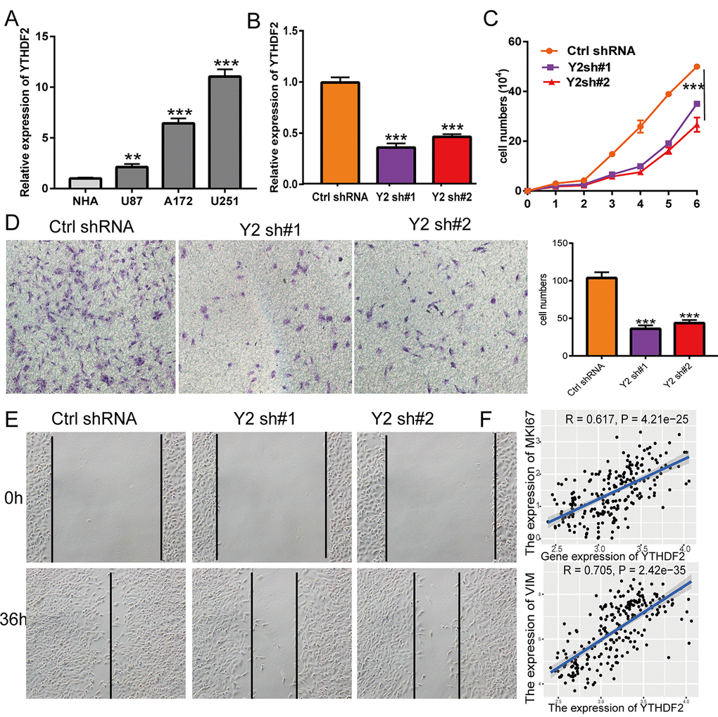 To examine the function of YTHDF2 in LGG, we used the qRT-PCR assay to detect the YTHDF2 expression in glioma cell lines. The results show that YTHDF2 was the high expression in glioma cell lines, especially in U251cells (Figure 12A). Owing to the higher expression of YTHDF2 in glioma cell lines, we construction the YTHDF2 knockdown cells and using the qRT-PCR assay verify the knockdown efficiency (Figure 12B). By performing the loss of function for YTHDF2 in U251cell, we found that YTHDF2 knock down was significantly inhibited the cell proliferation of U251 cells by growth curve assay (Figure 12C). Additionally, the decreased migration ability of U251 cells was observed in the knockdown of YTHDF2 (Figure 12D, 12E). We also uncover that YTHDF2 was strongly correlated with Ki-67 expression (r = 0.617, P = 4.21e-25) and vimentin (r = 0.705, P = 2.42e-35) (Figure 12F).