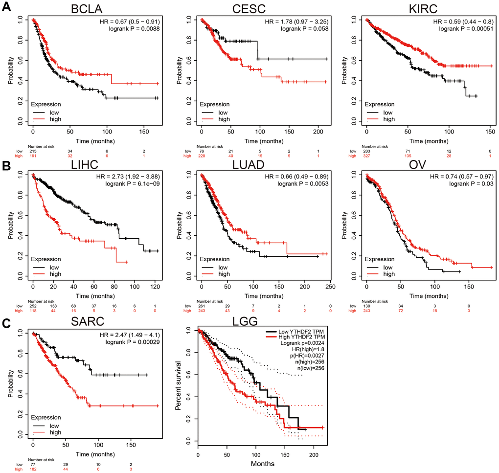 We employed KM plot to explore the prognostic value of YTHDF2 expression in human cancer. Our results confirmed that higher level of YTHDF2 overexpression closely correlates to the poor clinical prognosis of LIHC, SARC, and LGG. On the contrary, up-regulation of YTHDF2 correlated with a better prognosis in BLCA, CESC, KIRC, LUAD, and OV (Figure 2).