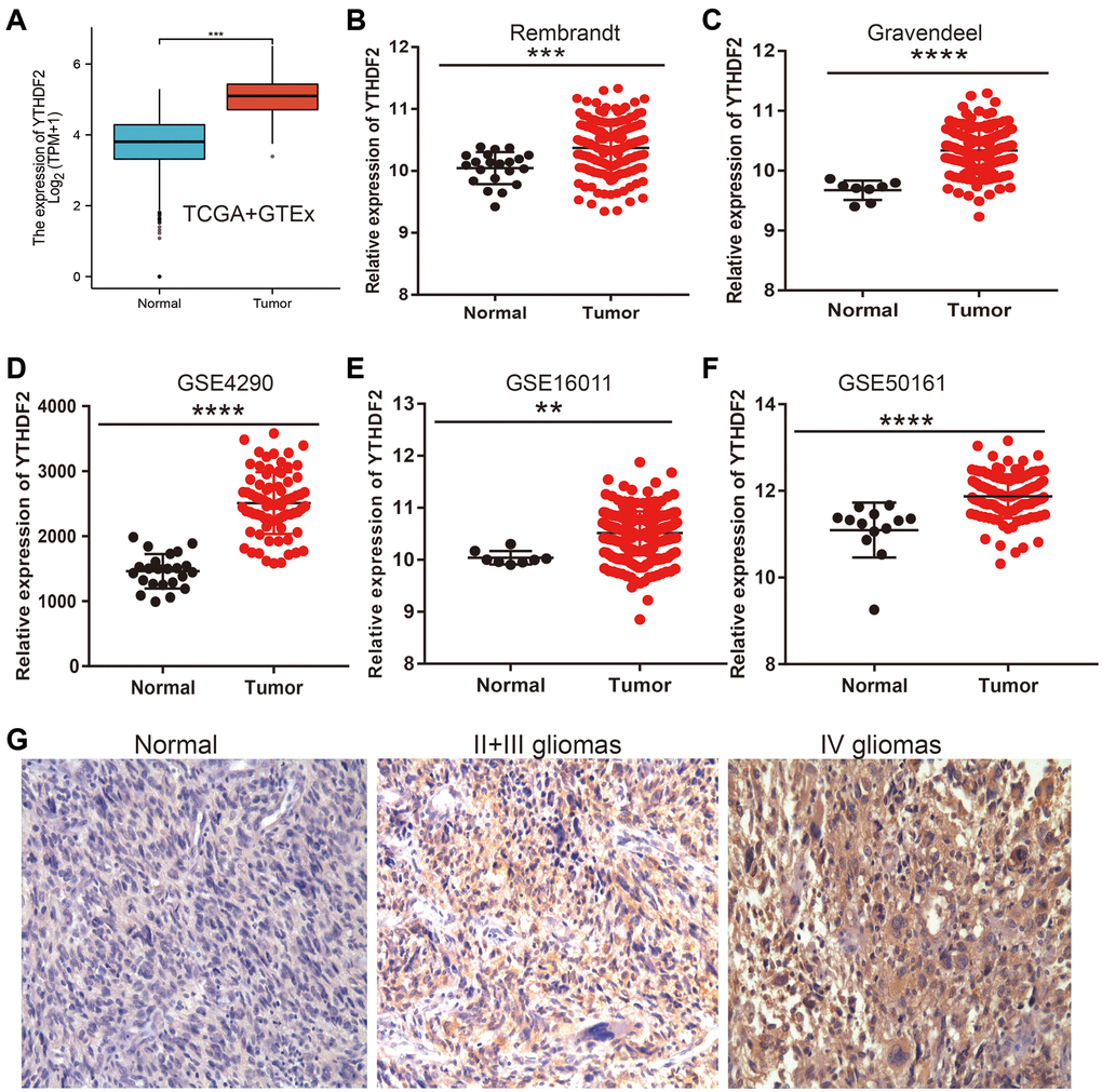 To determine the expression of YTHDF2 in LGG, we adopt the public database to examine the expression of YTHDF2 in glioma tissues and normal group. Results found out that YTHDF2 was overexpressed in the LGG tissues (Figure 3A–3C). Similar results were also obtained from the diverse GEO datasets (Figure 3D–3F). Furthermore, the results demonstrated that the YTHDF2 protein level was increased in glioma tissues (Figure 3G). Collectively, these data indicate that YTHDF2 was up-regulated in glioma tissues and high expression of YTHDF2 was significantly correlated with the tumor grade of LGG.
