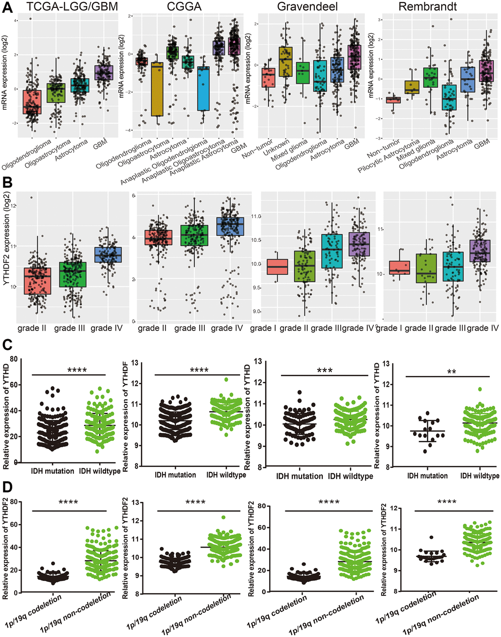 We employed the TCGA (https://www.cancer.gov/), GEO (https://www.ncbi.nlm.nih.gov/geo/query/acc.cgi), CGGA (http://www.cgga.org.cn/) [6], Rembrandt (http://gliovis.bioinfo.cnio.es/) [7] and Gravendeel (http://gliovis.bioinfo.cnio.es/) [8] to examine the expression pattern, clinical significance and prognosis of YTHDF2 in LGG.