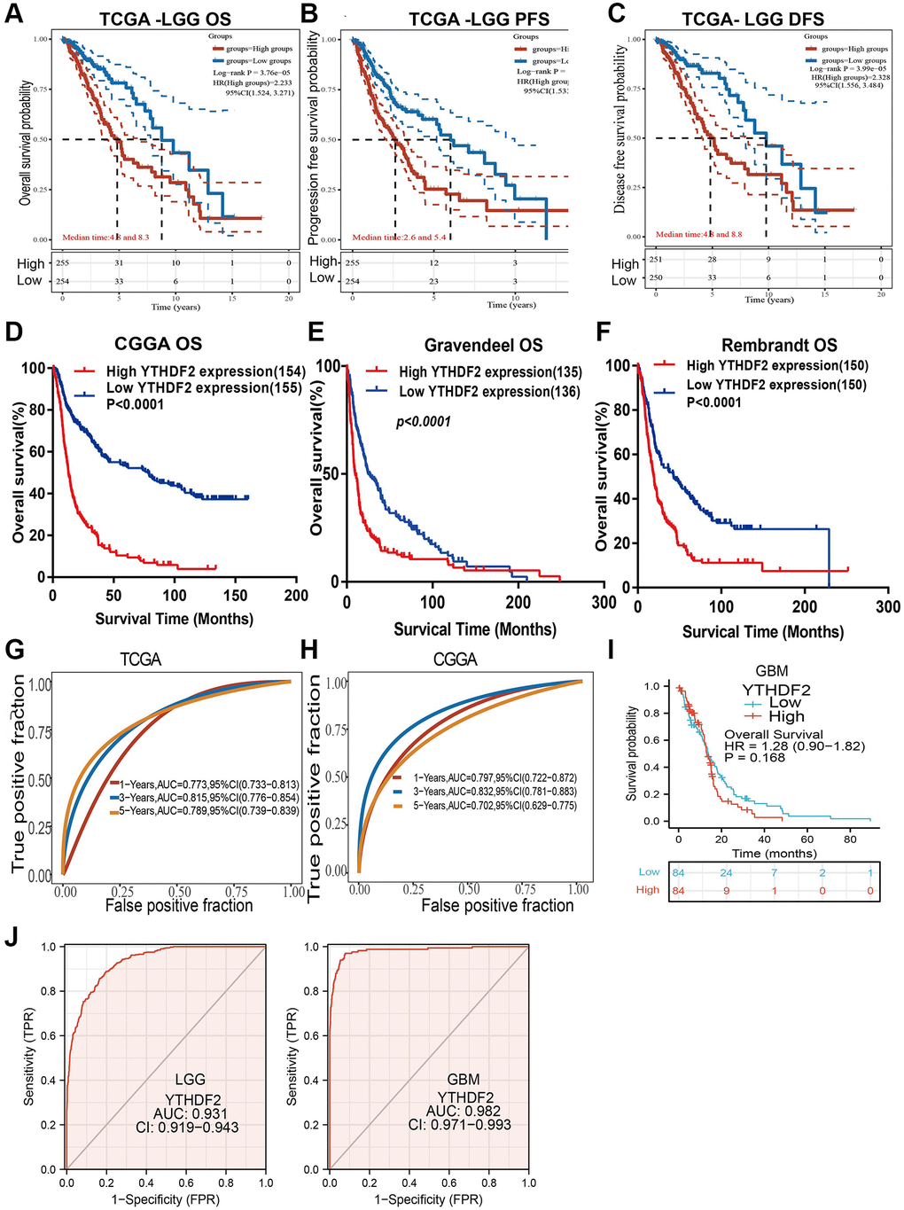 We found that up-regulation of YTHDF2 was correlated with the unfavorable prognosis of glioma patients in different datasets (Figure 5A–5F). Additionally, we perform the ROC curves analysis showed that the area under the curve (AUC) of YTHDF2 were 0.773, 0.815, and 0.789 for the TCGA-LGG datasets (Figure 5G), 0.797, 0.832, and 0.702 for the CGGA datasets (Figure 5H) in 1, 3, and 5 years, respectively. In GBM, the overall of patients no significant difference between high and low YTHDF2 group (Figure 5I). ROC curve of YTHDF2 show an AUC value of 0.982 and 0.931 based on the TCGA-GBM and TCGA-LGG dataset (Figure 5J).