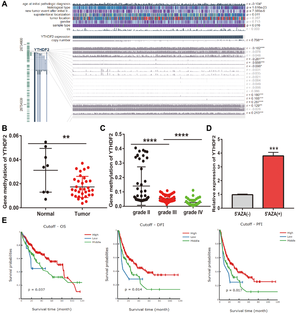 DNA methylation plays a crucial role in the regulation of gene expression. To elucidate the abnormal up-regulated mechanisms of YTHDF2 in LGG tissues, we further examine the relationship between DNA methylation, CNV, and the expression of YTHDF2 in gliomas. Firstly, we found that CNV of YTHDF2 was positively correlated with the expression (r = 0.798, p < 0.0001) (Figure 6A). Furthermore, we confirmed that various methylation sites in the promoter region of YTHDF2, among these methylation sites, the cg28734000 was negative correlated with the expression of YTHDF2 in LGG (r = 0.–0.556, p < 0.0001). CGGA dataset also obtained same results (Figure 6B, 6C). 5-Azacytidine, as an inhibitor of DNA methyltransferase [16], was used to treat the U251 cells, the results show that inhibiting the DNA methylation could significantly enhance YTHDF2 RNA levels in U251 cells (Figure 6D). Finally, we uncovered that lower methylation levels on the cg28734000 site correlate with adverse clinical outcomes in the TCGA-LGG dataset examined by the measure database (Figure 6E).