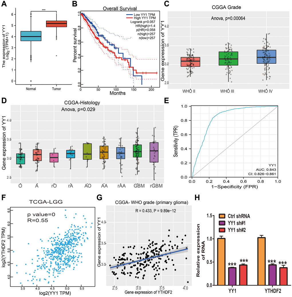 In order to determine the aberrant up-regulation of YTHDF2 in LGG, we employed JASPAR, Knock TF, and PROMO algorithms” to predict the potential transcription factors that may bind to YTHDF2 promoters. The results found that there are 4 common transcription factors in both prediction results, including the STAT3, JUN, MAF, and YY1. Then, we used the GEPIA database to analyze the correlation between these transcription factors and YTHDF2 expression in glioma samples based on the TCGA and CGGA dataset and found that only YY1 was positively associated with YTHDF2 expression. We also found that among these transcription factors, only YY1 was up-regulated in LGG specimens (Figure 7A). Elevated YY1 expression related to poor OS in TCGA-LGG (Figure 7B). Additionally, we found that YY1 expression was significantly increased in diverse WHO grade (p = 0.0006), (Figure 7C), and histology (p = 0.02, Figure 7D). ROC curve analysis of YY1 showed an AUC value of 0.843 in LGG patients (Figure 7E). By analyzing the TCGA LGG and CGGA datasets, we found that YY1 was strongly correlated with YTHDF2 expression (Figure 7F, 7G). Finally, to validate the above results, we performed the qRT-PCR assay, we found out that knock-down of YY1 was markedly reduced the YTHDF2 levels in U251 cells (Figure 7H). These results confirmed that YY1 can increase YTHDF2 expression via modulating the transcription process of YTHDF2 in glioma cells.