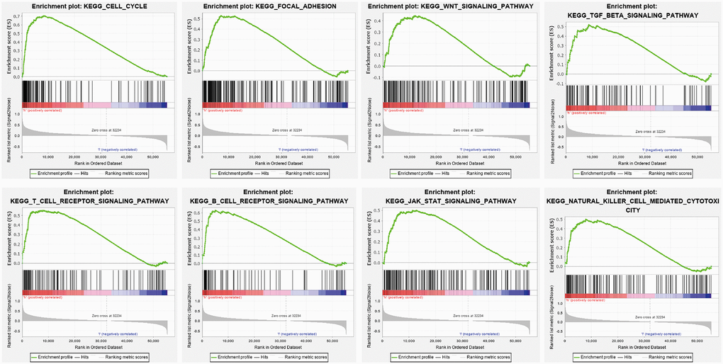 To determine the signaling pathway affected by YTHDF2 in LGG, we performed the GSEA enriched analysis using the GSEA software, results showed that YTHDF2 was mainly involved in the cell cycle, Focal adhesion, Wnt signal pathway, JAK- STAT3-signal pathway (Figure 8).