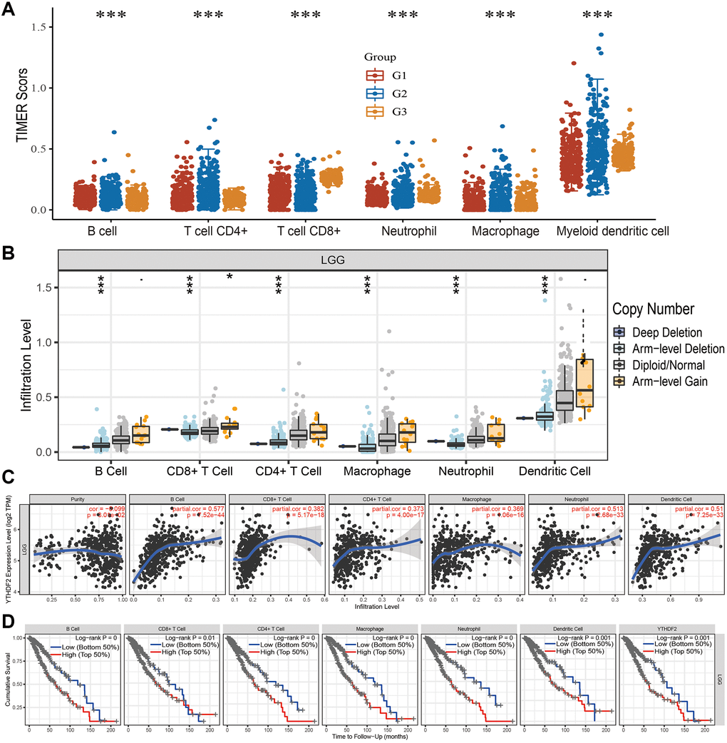 RNA m6A modification is a regular mRNA modification, it was first identified in the 1970s [3]. Accumulating evidence demonstrated that YTHDF2, as a member of m6A reader protein, plays a crucial role in RNA metabolism and cancers progression [4]. For example, it has been confirmed that YTHDF2 was up-regulated in HCC and correlated with adverse clinical outcomes in patients [5]. However, there was no study on its expression level and immune roles in glioma.