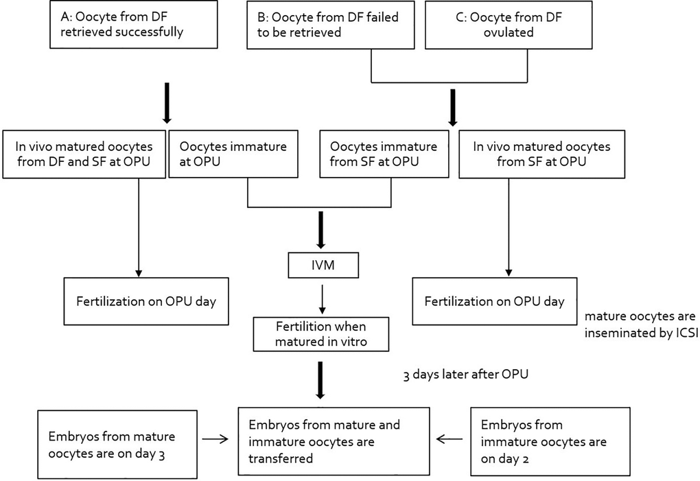 In clinical practice, the key point for natural cycle IVF/M treatment is the combination of oocyte from dominant follicle (DF) with the other oocytes from non-dominant follicles [8, 18, 19, 28–30]. This procedure, therefore, represents an interesting model for studying the development capacity from dominant and small follicles involved in the oocyte maturation process. In terms of the dominant follicles, whether or not ovulated when ultrasound scanning at retrieving, how to successfully retrieve the oocyte from DF, whether or not successfully retrieved were the focus we care for. For the oocyte from non-dominant follicles, the maturity and the rate of in vitro maturation (IVM) were the focus we concentrate on. Therefore, the pattern of oocyte from DF and SF at the time of retrieval is closely related to the development capacity of resulted embryos and the clinical outcomes after embryo transfer (ET). However, little is known about how the pattern of DF in clinical practice actually influences the development capacity of oocytes from small follicles even though after ovulation and the subsequent clinical outcomes in detail. Therefore, the real place for it has yet to be defined as we lack information for the oocytes from the small follicles when the dominant follicle was selected and ovulated in natural cycle IVF/M treatment.