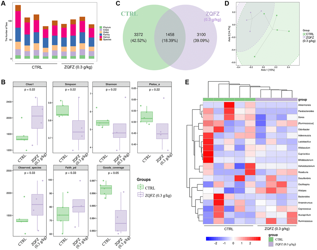 Compared with control mice, ZQFZ-treated mice had an altered composition of the microbial colonies in the intestine, according to the diversity of the composition spectrum of the microbial community (Figure 2A and 2D). Alpha diversity reflects the diversity of microbial communities based on a variety of indicators, including the Chao1 and observed species indices (characterization of abundance), the Shannon and Simpson index (characterization of diversity), Faith’s phylogenetic diversity index (characterization of diversity based on evolution), Pielou’s evenness index (characterization of evenness) and Good’s coverage index (characterization of coverage) [26]. The richness and diversity based on evolution index values showed upward trends, but the diversity, evenness and coverage index values showed downward trends in the ZQFZ-treated mice compared with the control mice, based on the grouped box plot of the alpha diversity index values. However, no significant differences were observed between the groups (Figure 2B). Meanwhile, of the 7,930 ASVs detected, 1,458 (18.39%) were found in both control and ZQFZ-treated mice. In ZQFZ-treated mice, 3,100 unique ASVs (39.09%) were detected and in control mice, 3,372 (42.52%) were detected, indicating a difference in bacterial community composition between the two groups (Figure 2C). The bi-clustered genus-level species composition heat map analysis showed that the top 20 nodes in terms of richness in the intestine were altered after ZQFZ treatment (Figure 2E). According to the linear discriminant analysis (LDA) effect size, 11 nodes were significantly changed by ZQFZ treatment (p < 0.05, LDA > 2), such as Porphyromonadaceae (family), Mogibacteriaceae (family), Verrucomicrobia (phylum) and Actinobacteria (class) (Table 1).