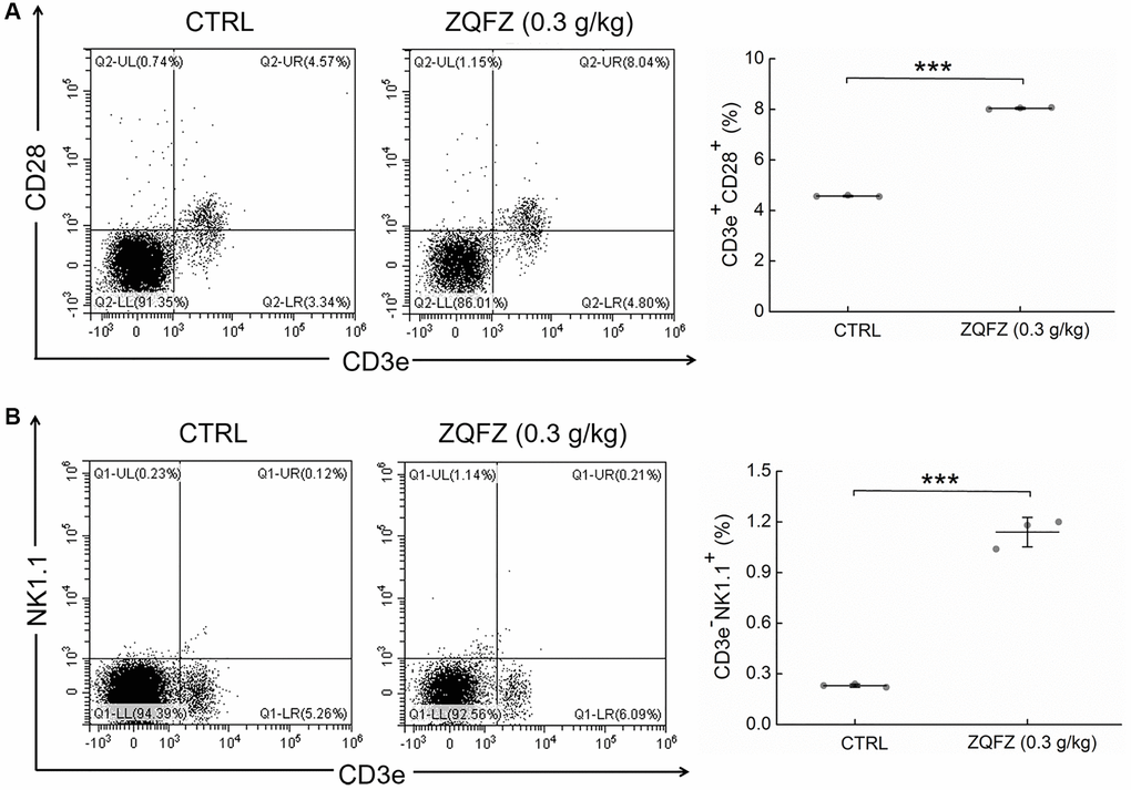 Compared with control mice, ZQFZ-treated mice had significantly increased proportions of CD3+CD28+ T cells (4.57% vs. 8.04%, p < 0.001, Figure 3A) and NK cells (0.23% vs. 1.14%, p < 0.001, Figure 3B) in the peripheral blood.