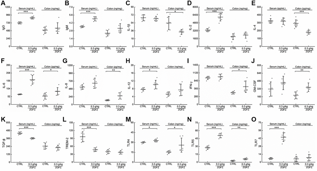 Changes in an ecological imbalance of the intestinal microbiota lead to abnormal immune responses and thus increase the risk of CRC [27]. Flow cytometry results showed that ZQFZ had a regulatory effect on immune cells in the peripheral blood of ApcMin/+ mice. Therefore, we analyzed cytokine levels in the serum and tumors of ApcMin/+ mice. ZQFZ significantly increased the serum levels of IgG (p < 0.001, Figure 4A), IgM (p < 0.001, Figure 4B), IL-2 (p < 0.001, Figure 4D), IL-12 (p < 0.05, Figure 4H) and TLR7 (p < 0.001, Figure 4O) and decreased the levels of TGF-β (p < 0.001, Figure 4K) and TREM-2 (p < 0.001, Figure 4L). Concurrently, ZQFZ increased the levels of IL-8 (p < 0.01, Figure 4G), IFN-γ (p < 0.05, Figure 4I) and GM-CSF (p < 0.01, Figure 4J) and decreased the levels of IL-1β (p < 0.05, Figure 4C) and IL-4 (p < 0.001, Figure 4E) specifically in the colon. The levels of IL-6 (p < 0.05, Figure 4F), TLR4 (p < 0.05, Figure 4M) and TLR5 (p < 0.01, Figure 4N) were upregulated by ZQFZ treatment in both the serum and colon.