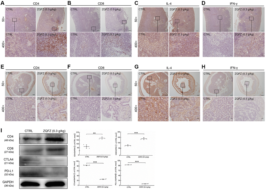 CD4+ and CD8+ T cells are the main indicators of cellular immune responses [28]. CD4+ T cells further differentiate into Th1 and Th2 cells. IFN-γ and IL-4 are the characteristic cytokines of Th1 and Th2 cells, respectively, and they are used to determine the number of cells [29, 30]. According to the images of immunohistochemically stained sections, ZQFZ increased the number of CD4+ and CD8+ T cells (Figure 5A, 5B, 5E, 5F), and IFN-γ levels in both colorectal tumors and the spleen (Figure 5D, 5H), but had no effect on IL-4 levels (Figure 5C, 5G). Western blotting analysis of the colorectal tumors confirmed that treatment with 0.3 g/kg of ZQFZ significantly upregulated the expression levels of CD4 by 65.16% (p < 0.01) and of CD8 by 50.63% (p < 0.001), compared with their levels in control mice. In contrast, the expression levels of CTLA4 and PD-L1 were significantly decreased by 69.38% (p < 0.001) and 92.01% (p < 0.001), respectively, after ZQFZ treatment (Figure 5I).