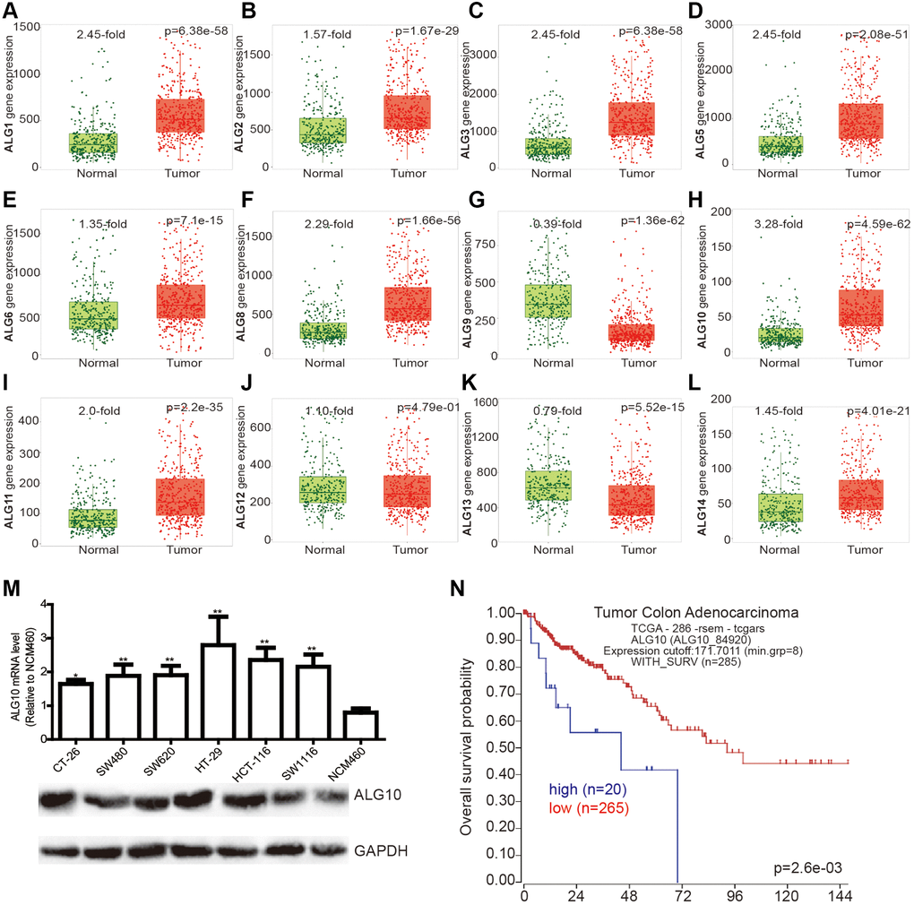 The online analytic tool (TNMplot: https://tnmplot.com/analysis/) was used to analyze the expression of ALG family members (ALG1, ALG2, ALG3, ALG5, ALG6, ALG8, ALG9, ALG10, ALG11, ALG12, ALG13, ALG14) in CRC and normal tissues. The correlation between ALG10 expression and survival of CRC patients was determined through another online analytic tool (R2: Genomics Analysis and Visualization Platform).