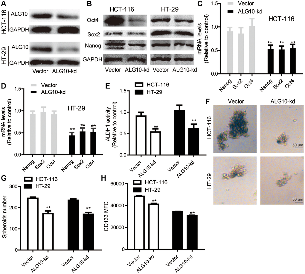 Based on above results, we assumed that ALG10 played an important role during CRC progression. We preferably focused on its effects on the stemness of CRC cells as CSC is regarded as the main cause of tumorigenesis. ALG10 was knocked down in CRC cells and knockdown efficiency was confirmed by Western blot (Figure 2A). It was shown that ALG10 knockdown inhibited the expression of stemness markers (Nanog, Sox2, Oct4) (Figure 2B–2D). Since ALDH activity and sphere-formation ability were remarkably upregulated in CSC [12], we further detected ALDH activity and sphere-formation ability in CRC cells with ALG10 knockdown. As shown in Figure 2E, ALDH activity was reduced in CRC cells by ALG10 knockdown. Moreover, the capability of sphere-formation was suppressed by ALG10 knockdown, as characterized by the reduction of sphere number and size (Figure 2F and 2G). In agreement with these results, the CD133+ sub-population of CRC cells with stemness was attenuated by ALG10 knockdown through flow cytometry analysis (Figure 2H).