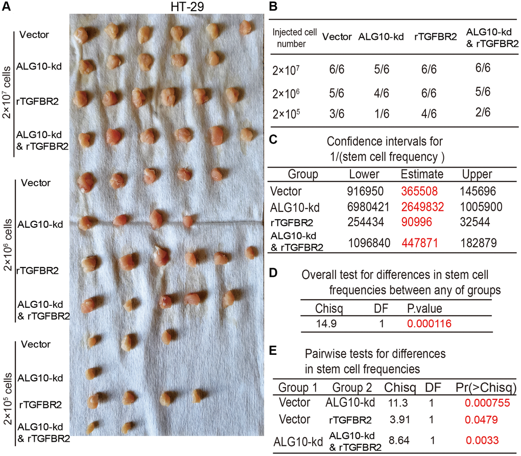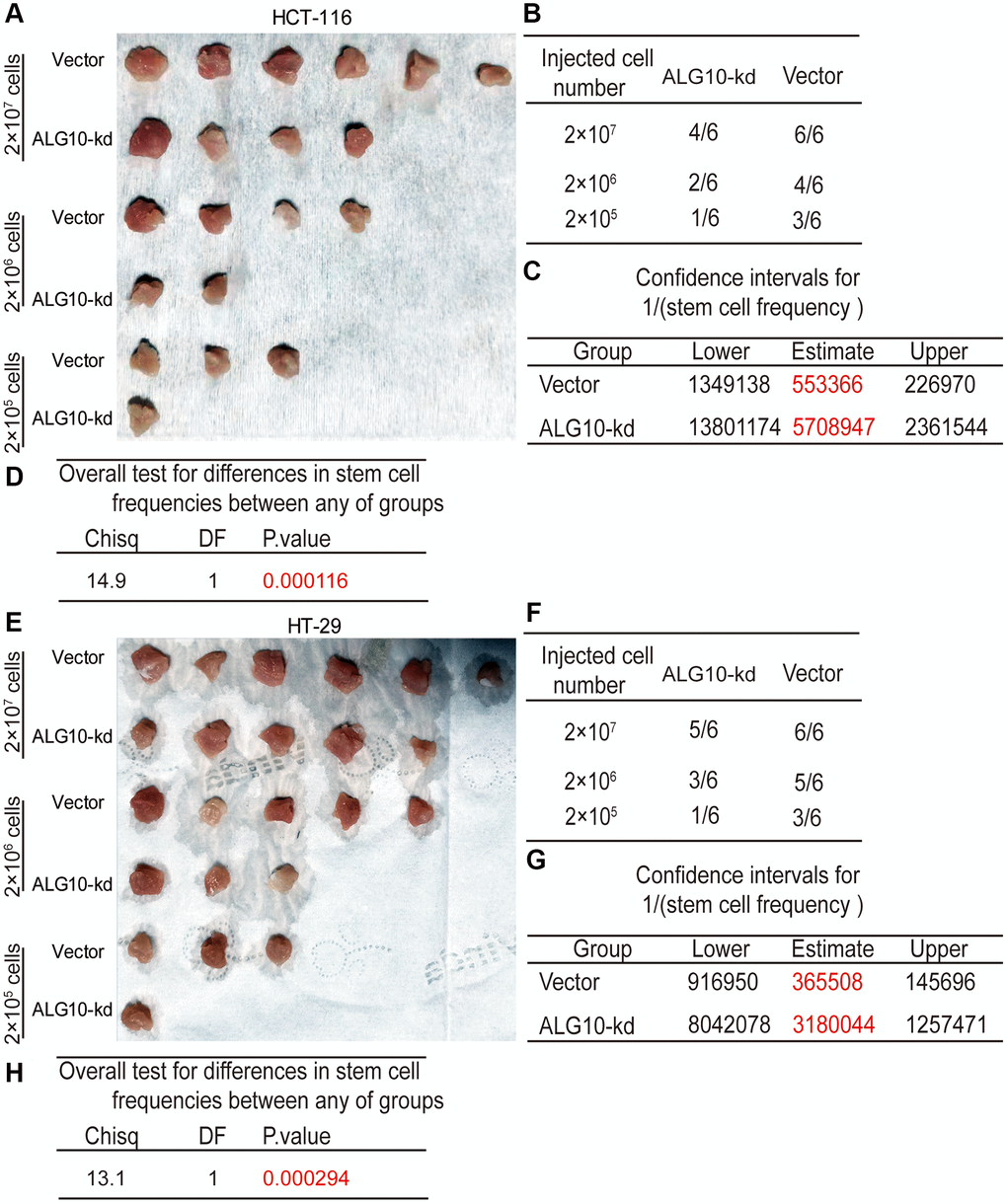 We tried to detect the effects of ALG10 on the tumor-initiating ability of CRC cells, which is positively correlated the stemness of tumor cells. CRC cells with or without ALG10-stable knockdown were seeded into BALB/c nude mice at three different cell density as indicated. We found that the tumorigenic ability of CRC cells with ALG10 knockdown was decreased, which was evident by the decreased tumor-formation rate (Figure 3A and 3B, Figure 3E and 3F) and stem cell frequency using the tumor-limiting dilution assay (Figure 3C and 3G). Additionally, overall test for differences in stem cell frequencies between two groups exhibited a remarkable significance (Figure 3D and 3H).