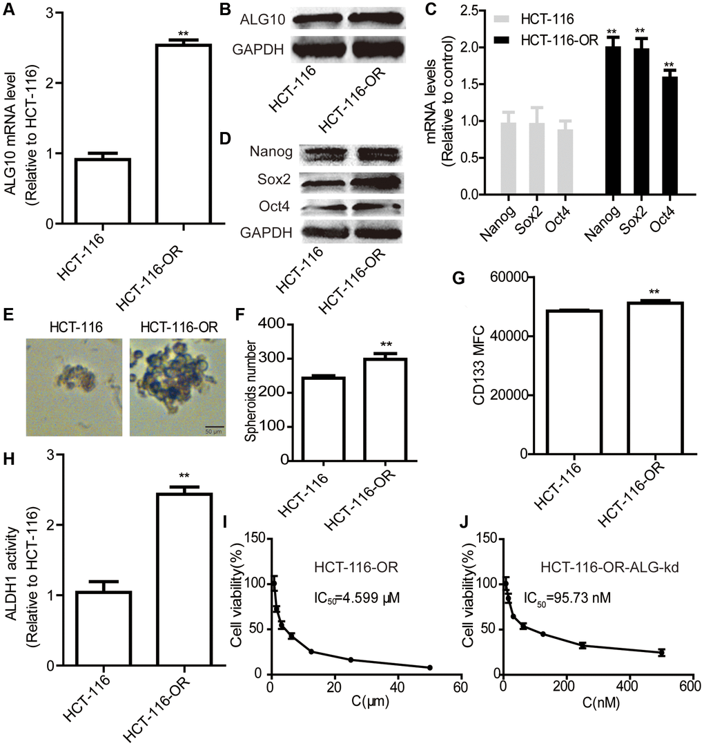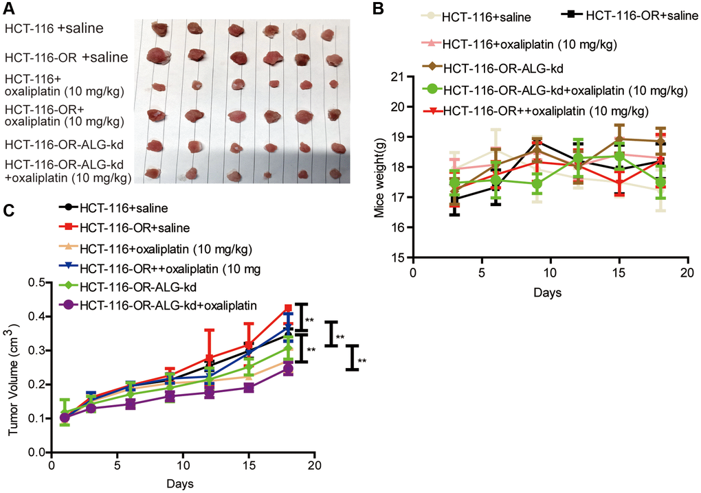 Since chemoresistance has been shown to be led by the existence of CSCs, we wondered whether ALG10 contributed to chemoresistance in CRC cells. As shown in Figure 4A and 4B, both ALG10 mRNA and protein levels were upregulated in HCT-116-OR cells compared to that in HCT-116 cells. Indeed, HCT-116-OR exhibited a stronger stemness than HCT-116 cells, which was characterized as the increase of stemness marker expression (Figure 4C and 4D), sphere-formation ability (Figure 4E and 4F), CD133+ subpopulation (Figure 4G), and ALDH activity (Figure 4H). Additionally, it was found that ALG10 knockdown attenuated oxaliplatin resistance of HCT-116-OR cells in vitro, which was evident by the decrease of IC50 value of oxaliplatin (4.599 μM vs. 95.73 nM) (Figure 4I and 4J) and in vivo (Figure 5). These results suggest that ALG10 can promote the stemness and chemoresistance of CRC cells.