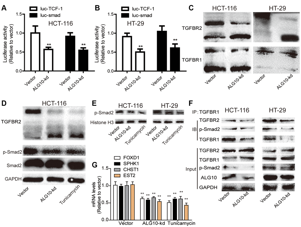 Then we explored the underlying mechanisms contributing to ALG10-mediated effects on CRC cell stemness. As several lines of evidence have demonstrated the critical role of TGF-β pathway in the maintenance of tumor stemness and ALG3, another ALG family member, has recently been reported to enhance TGFBR2 glycosylation [13], we wondered whether ALG10 held the similar effects on TGFBR2 with ALG3. Firstly, a luciferase assay was conducted in CRC cells with or without ALG10 knockdown. As shown in Figure 6A and 6B, it was found that ALG10 knockdown reduced the luciferase activity of luc-smad and luc-TCF-1, indicating that ALG10 could indeed activate TGF-β signaling in CRC cells. We then evaluated whether ALG10 has an effect on TGFBR2 glycosylation. As expected, we found that ALG10 knockdown significantly downshifted the TGFBR2 bands, but failed to downshift the TGFBR1 bands (Figure 6C). Interestingly, ALG10 knockdown failed to affect the total level of TGFBR2 (Figure 6C), implying that ALG10 promotes the activity of TGF-β signaling through glycosylation of TGFBR2 but not its expression. Tunicamycin is widely used as a research tool to block N-linked glycosylation, to verify whether the band shift was caused by a change in the glycans, tunicamycin was used as a positive control and ALG10 was knocked down in CRC cells. As shown in Figure 6D, the intensity of the lower TGFBR2 bands was decreased, leading to decreased p-smad2 level, this effect was consistent with that of tunicamycin treatment. As nuclear p-smad2 level is responsible for gene transcription, we further investigated the effect of ALG10 on nuclear transport of p-smad2, and we found the nuclear translocation of p-smad2 was significantly suppressed in both ALG10 knockdown and tunicamycin groups (Figure 6E). Moreover, the interactions between TGFBR1 and TGFBR2, and TGFBR1 and p-smad2, which were the downstream pathway of TGFBR2 underglycosylation, were clarified using Co-IP analysis. As shown in Figure 6F, the interactions between TGFBR1 and TGFBR2, and TGFBR1 and p-smad2 were weakened in colorectal cells with ALG10 knockdown. In consistent, the expression of downstream effectors (FOXD1, SPHK1, CHST1, EST2) of TGF-β signaling was significantly reduced by both ALG10 knockdown and tunicamycin treatment (Figure 6G). Thus, our results indicated that downregulation of ALG10 inhibits TGF-β signaling by disturbing TGFBR2 glycosylation.