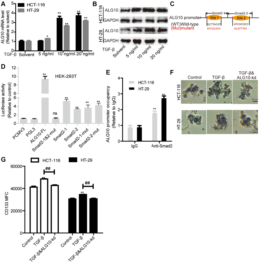 Interestingly, we found that TGF-β could upregulate ALG10 level in CRC cells (Figure 7A and 7B). Then we explored the underlying mechanisms by which TGF-β upregulates ALG10 level. Bioinformatics analysis (The JASPAR database: http://jaspar.genereg.net/search/?q=&collection=CORE&tax_group=vertebrates) showed that Smad2, the downstream effectors of TGF-β, can bind to ALG10 gene promoter with two potential binding sites (Figure 7C). Further luciferase reporter assay with or without truncated fragments of ALG10 gene promoter indicated that Smad2 can bind to both of the two binding sites (Figure 7D), which was further confirmed by ChIP analysis (Figure 7E). Notably, TGF-β could promote the stemness of CRC cells in an ALG10-dependent manner, which was characterized as the change of sphere-formation ability (Figure 7F) and CD133+ subpopulation (Figure 7G).