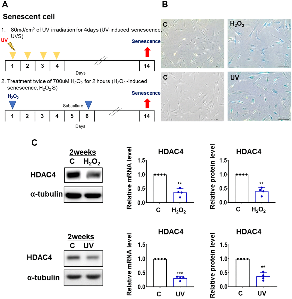 To understand the role of HDAC4 in the senescence process, we first examined changes in HDAC4 expression in two different cellular senescence models: H2O2-induced senescence (H2O2S) and UV-induced senescence (UVS) (Figure 1A). The induction of H2O2S and UVS models was confirmed using SA-β-gal staining (Figure 1B, upper and lower panels, respectively). The expression of HDAC4 mRNA and protein was significantly decreased in both H2O2S and UVS models (Figure 1C). This implies that reduced HDAC4 expression is a consistent finding under senescence conditions.