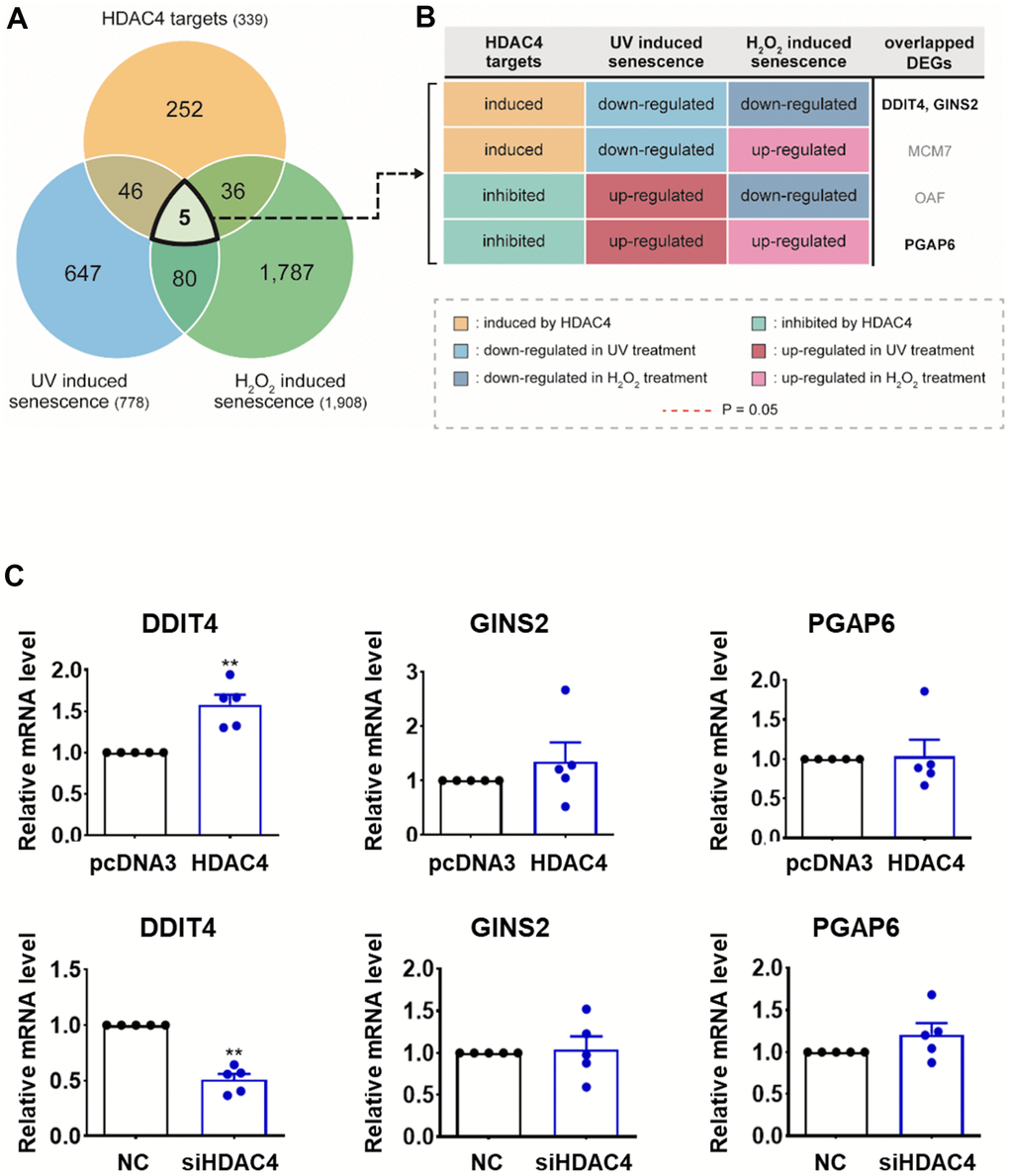 To sort out more reliable targets of HDAC4 involved in the regulation of skin aging, we compared our DEGs with those identified from the two previously reported transcriptome datasets, which were generated from UV-[23] and H2O2-induced senescent HDFs [24]. Among the 778 DEGs from UV-induced senescence [23] and 1,908 DEGs from H2O2-induced senescence [24] (Figure 2A), 51 and 41 genes were shared with our DEGs, respectively. Only five genes (DDIT4, GINS2, MCM7, OAF, and PGAP6) overlapped among the DEGs from previous senescence models and our HDAC4-modulated model. Among them, given the reduced HDAC4 level in senescent cells, DDIT4 and GINS2 induced by HDAC4 were downregulated, and PGAP6 suppressed by HDAC4 was up-regulated consistently in both H2O2- and UV-induced senescence models (Figure 2B). In contrast, MCM7 and OAF showed inconsistent changes in the HDAC4-modulated and senescence models. Therefore, the validity of the three genes with consistent changes as HDAC4 targets was tested using quantitative RT-PCR. Among the three genes, only DDIT4 showed significant expression changes upon HDAC4 overexpression or knockdown (Figure 2C). Taken together, we finally selected DDIT4 as a potential target of HDAC4 involved in HDAC4-dependent epigenetic regulation of skin aging.