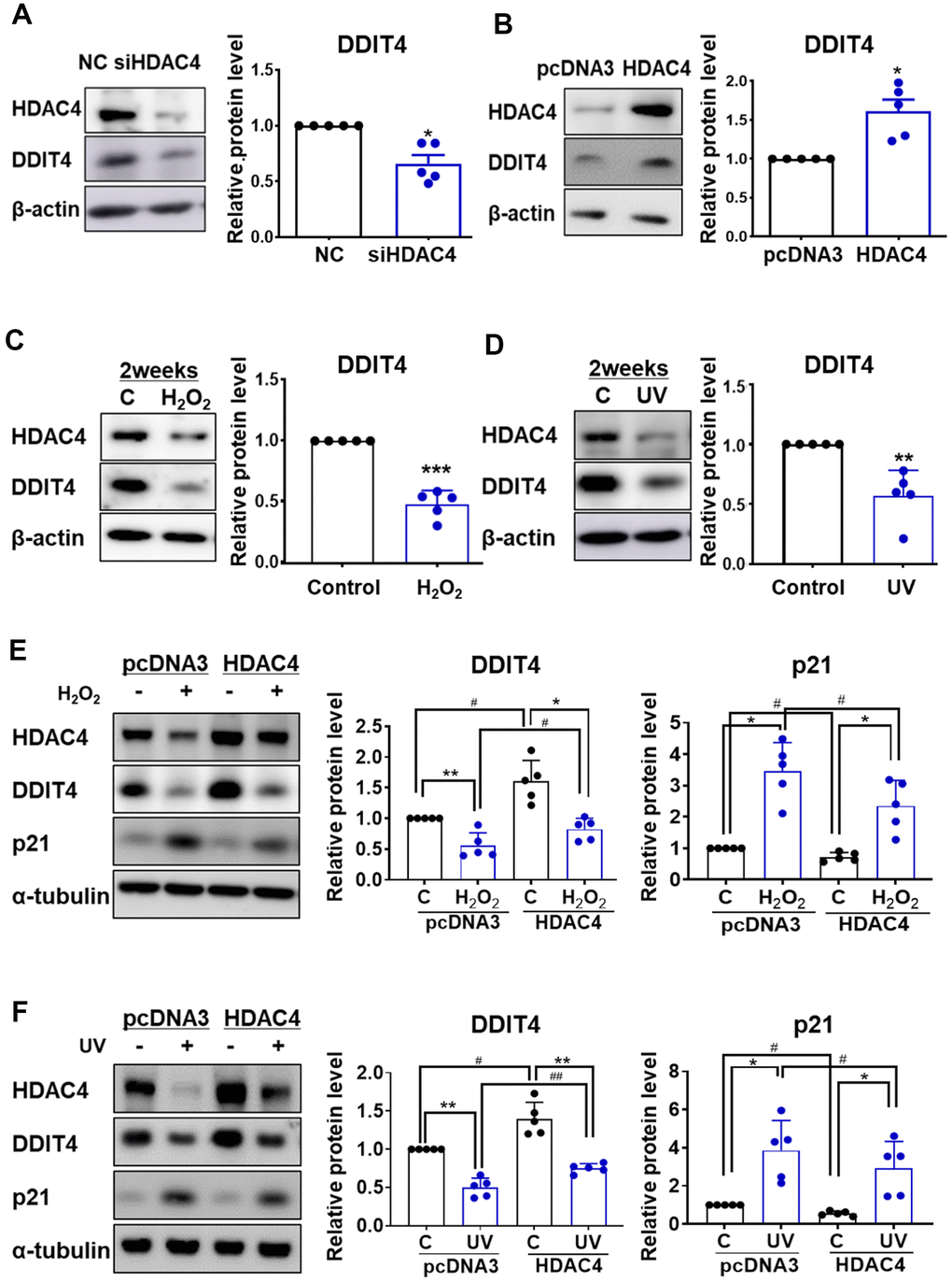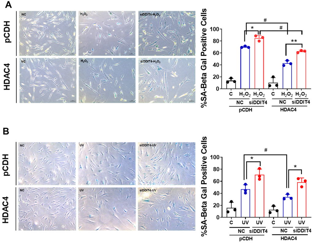 In conclusion, we demonstrated that HDAC4 was decreased in H2O2- and UV-induced cellular senescence models, and the overexpression of HDAC4 reduced senescence phenotypes and markers. DDIT4, a candidate target regulated by both HDAC4 modulation and cellular senescence, could reverse the expression of genes associated with aging, such as SASP, and SA-β-gal positive cells. These results provide novel insights into the regulatory role of the HDAC4-DDIT4 pathway in epigenetic skin aging.