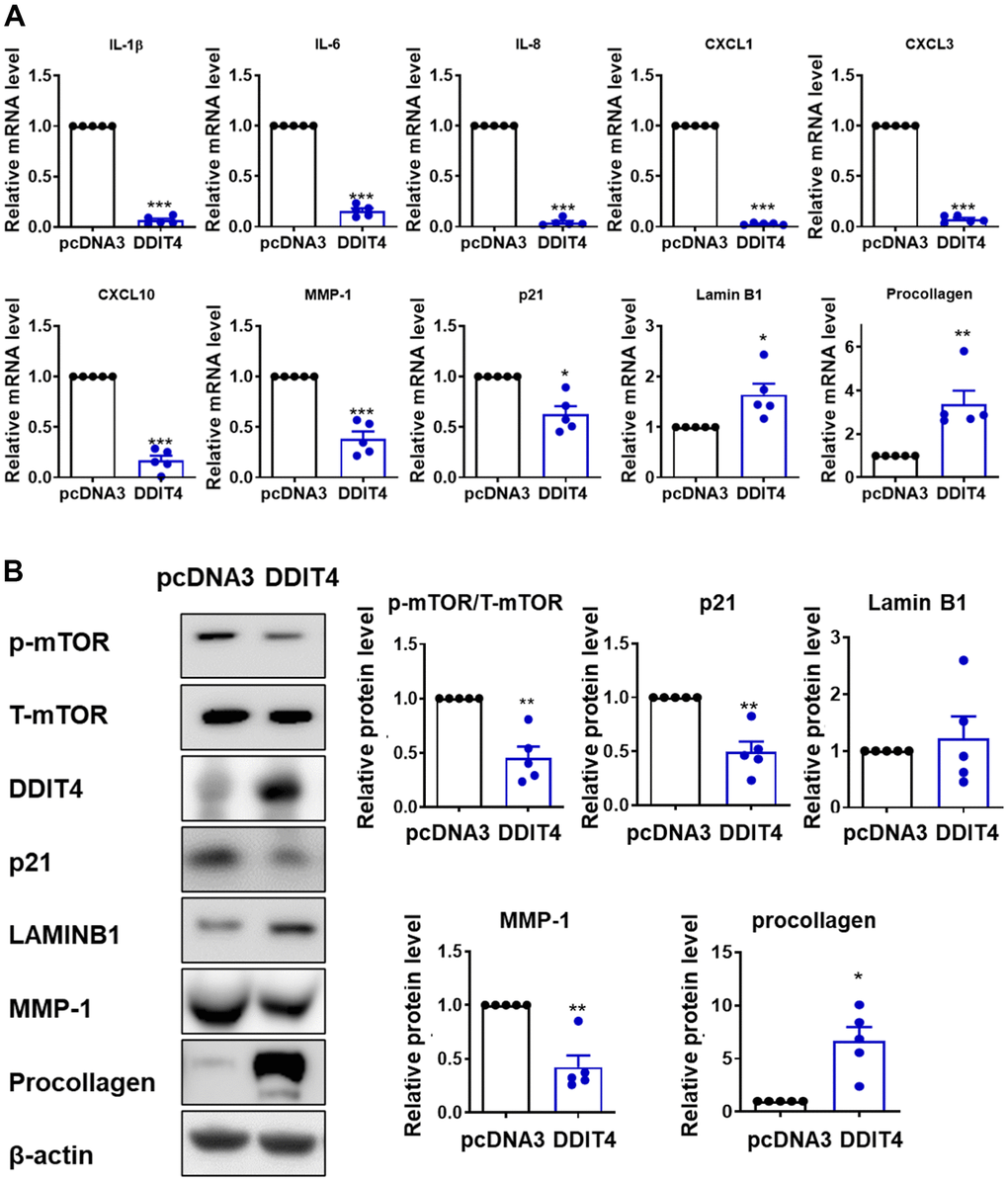 It has been reported that DDIT4 is associated with senescence [25–27], and our previous studies demonstrated that HDAC4 might be a key regulator of skin aging [17, 18]. However, little is known about the association between HDAC4 and DDIT4 during cellular senescence. We first examined whether HDAC4 regulates DDIT4. In accordance with the mRNA expression analysis, HDAC4 knockdown significantly decreased the expression of DDIT4 protein, while HDAC4 overexpression significantly increased it (Figure 3A, 3B). In contrast, overexpression or knockdown of DDIT4 did not change the expression of HDAC4, indicating that DDIT4 is a downstream target of HDAC4 (Supplementary Figure 2).