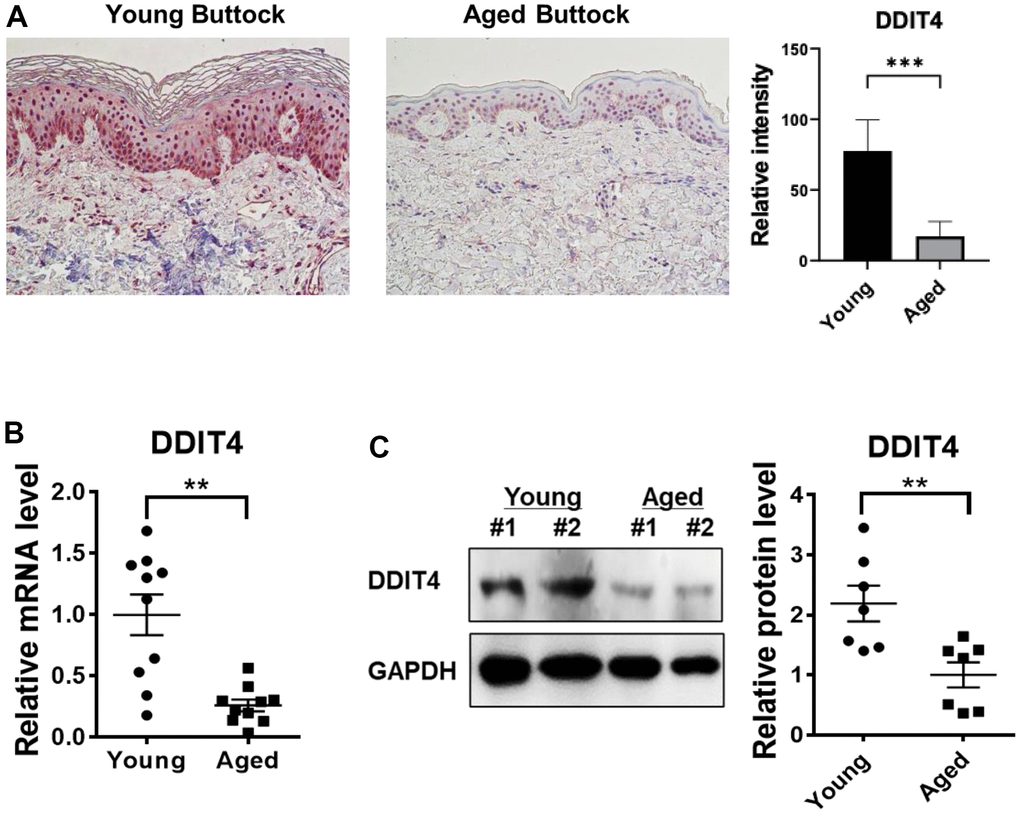 Finally, we validated DDIT4 expression in the human skin of young and elderly subjects in vivo. Immunohistochemistry of young skin showed that DDIT4 was strongly expressed in both the epidermis and dermis. DDIT4 was present mostly in the nucleus and partially in the cytoplasm, particularly in the basal epidermal layer. Sun-protected buttock skin from elderly subjects showed remarkably decreased DDIT4 expression compared to that in young individuals (Figure 6A).