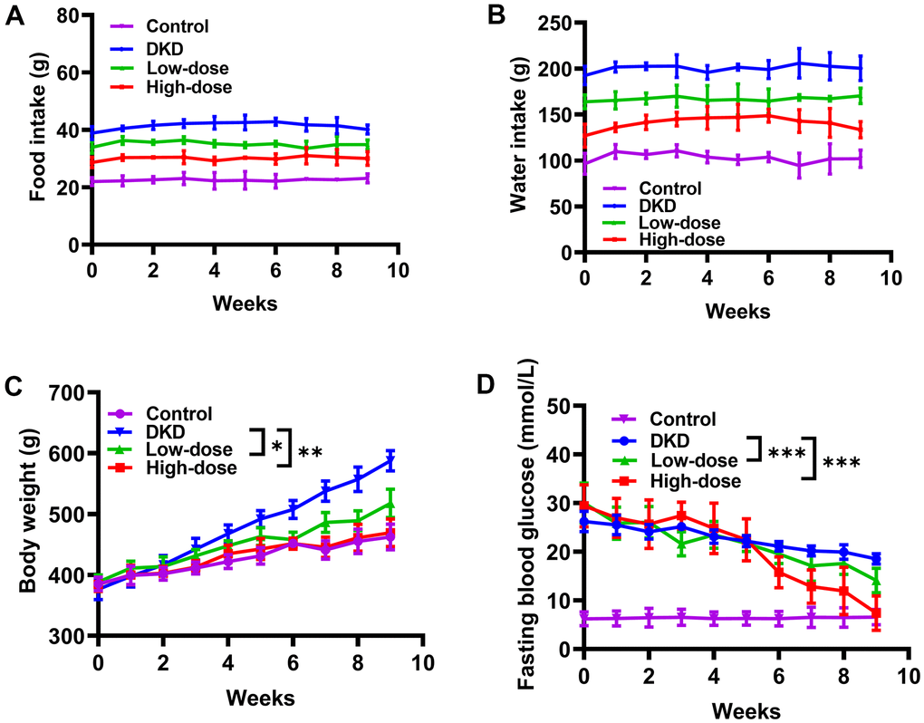 To evaluate the effect of Qidantang Granule in DKD rats, we chose two doses (low-dose: 50 mg/kg; high-dose: 200 mg/kg) to gavage DKD rats for 4 weeks. Compared to control mice, STZ-induced DKD mice displayed increased food intake (Figure 1A), water intake (Figure 1B), body weight (Figure 1C) and fasting blood glucose levels (Figure 1D), and all of which could be dose-dependently decreased by Qidantang Granule (Figure 1A–1D). Moreover, Qidantang Granule also time-dependently reduced fasting blood glucose of DKD rats, and high-dose of Qidantang Granule lowered fasting blood glucose to be close to the control group (Figure 1D). In addition, it was found that Qidantang Granule treatment decreased insulin resistance in the DKD rats (Supplementary Figure 1). This suggested that Qidantang Granule had inhibitory effect on blood glucose in DKD rats.